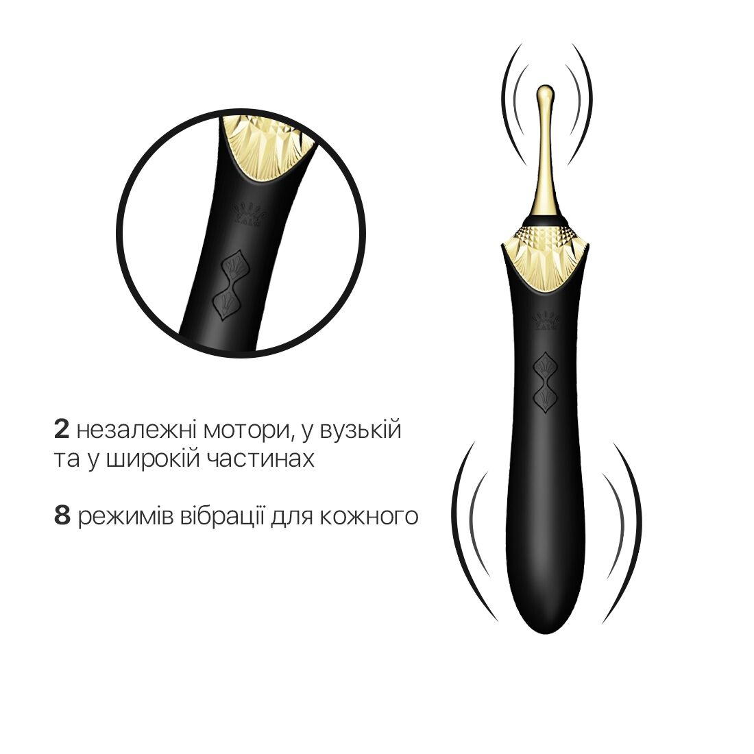 незвичайна форма: тонка частина для точкової стимуляції клітора — з одного боку, і ширша, схожа на класичний вібратор — з іншого;