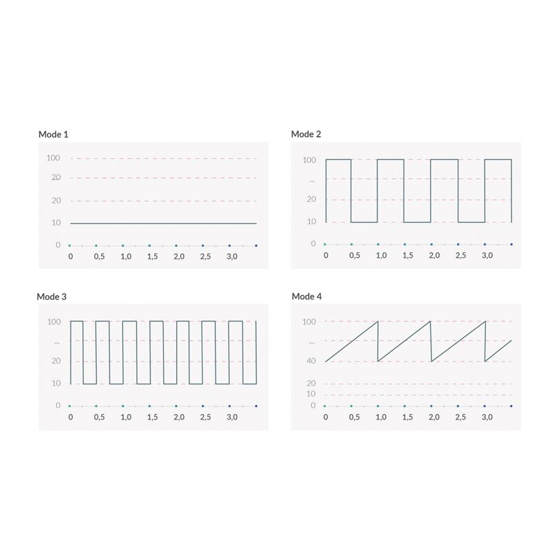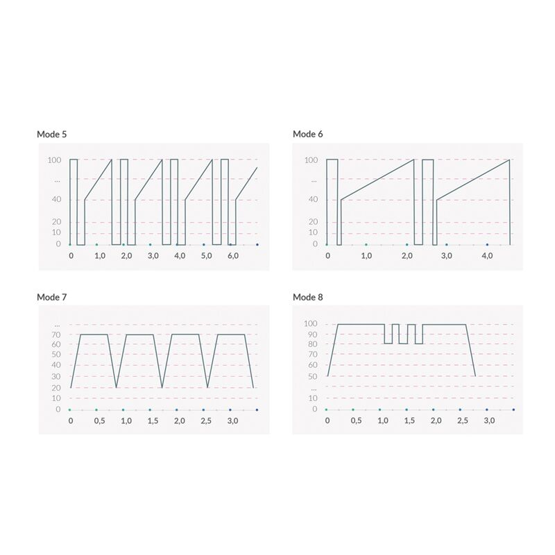 5 режимів електростимуляції: рівномірні поколювання, поколювання з чергуванням інтенсивності, рівномірна пульсація (імпульсний струм), пульсація різної інтенсивності, чергування поколювання та пульсації;