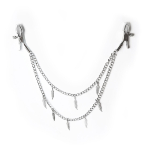 Пропонуємо купити затискачі з подвійним ланцюжком для сосків Art of Sex – Dream Catcher — ідеальний варіант для чуттєвої стимуляції. На затискачах є силіконові накладки, щоб під час затягування девайса не пошкодити ніжну шкіру сосків. Затискачі з’єднані між собою двома металевими ланцюжками, що не тільки має дуже естетичний та сексуальний вигляд, але й не дає несподівано втратити один із затискачів. Маленькі підвіски у вигляді пір’їнок по довжині ланцюжків додають цьому аксесуару грайливості. Спостерігати за рухами затискачів на грудях під час сексуальних практик — справжнє задоволення. За допомогою зручних регуляторів ви зможете вибрати силу стиснення, залежно від ваших із партнером вподобань.